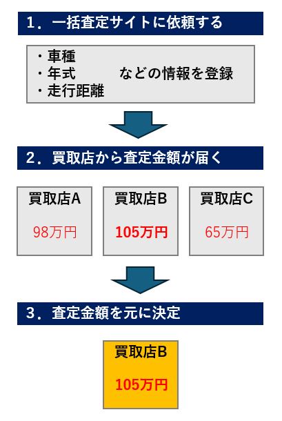 自らの足で複数の買取店を回って査定してもらうことを考えると、はるかに効率的に売却手続きを進めることができるのです。