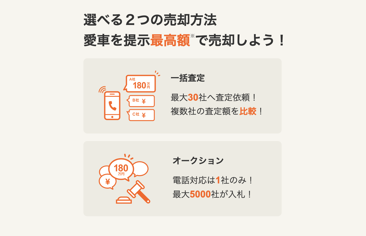 - 査定額は最大20社の競い合いの結果、開示される。このうち、査定額の高かった上位3社のみがユーザーと電話で交渉できる仕組みであるため、利用者の個人情報伝達や電話対応が少なくて済む。