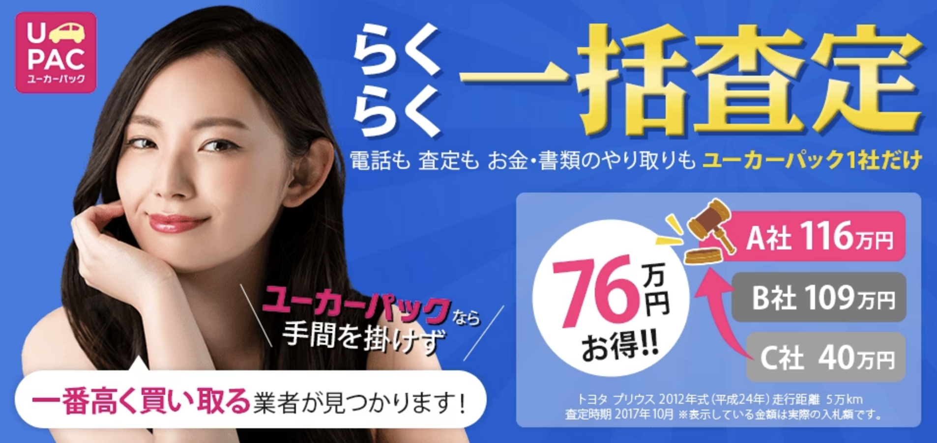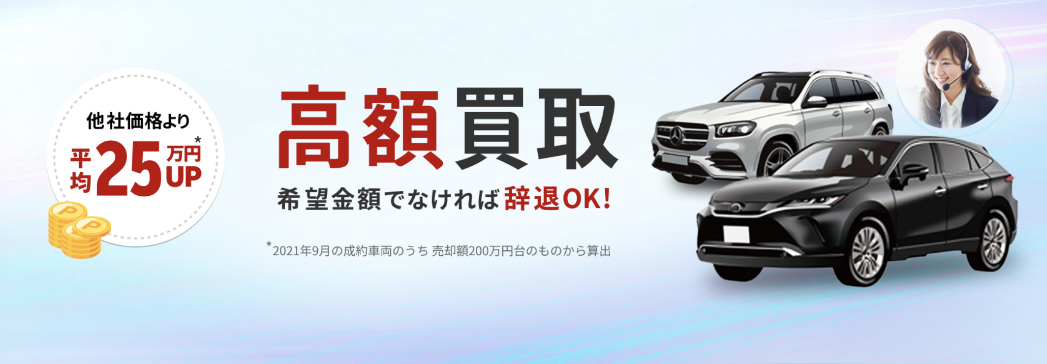 - ネットオークションが買取にいたるまでの中間コストをカット。「他社価格に対する査定額の平均25万円アップ」をうたう。