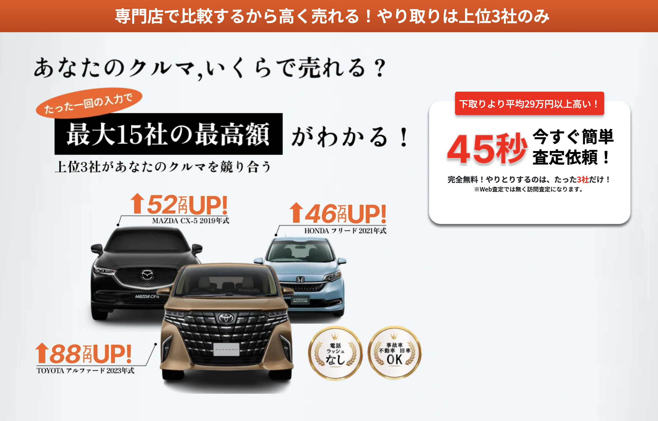 - 一括査定のオンライン申し込みは「所要時間45秒」をうたう簡単手続き。