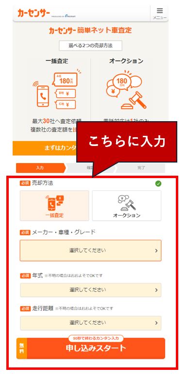 車一括査定サイトで必要事項を入力し、査定を申し込みます。以下で紹介しているカーセンサーに限らず、情報は最低限でプルダウン形式のメニューも多いため、容易な作業といえます。