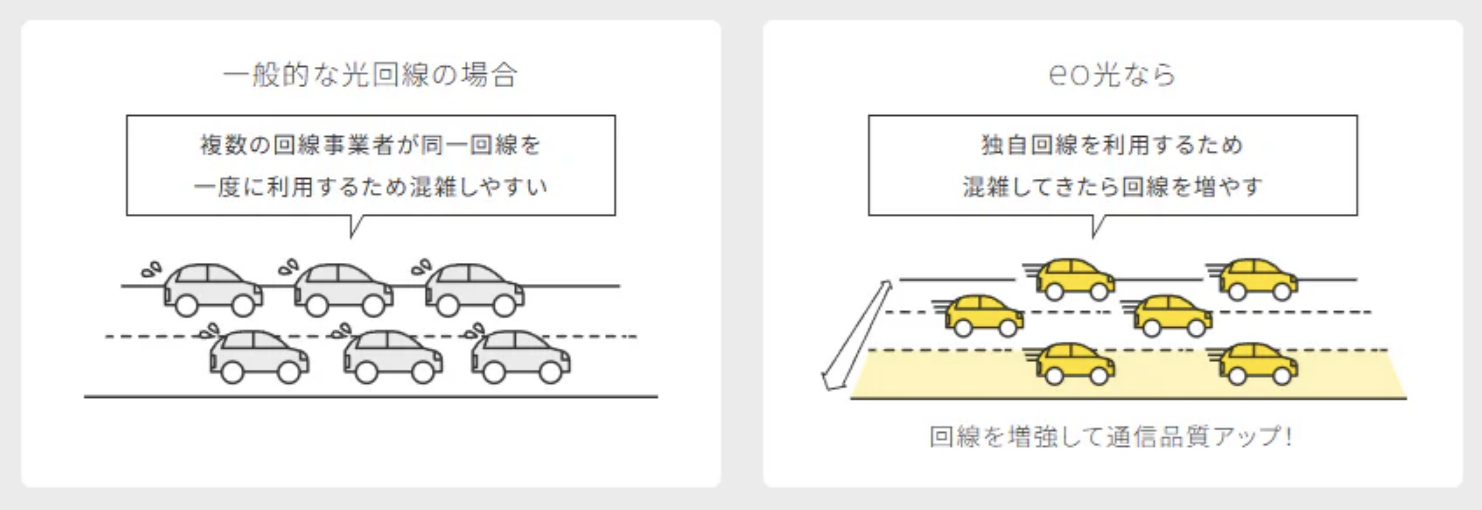 独自回線は、フレッツ光などの大手と比較して利用者数が多くないため、回線が混雑しにくく快適に利用できるという特徴があります。