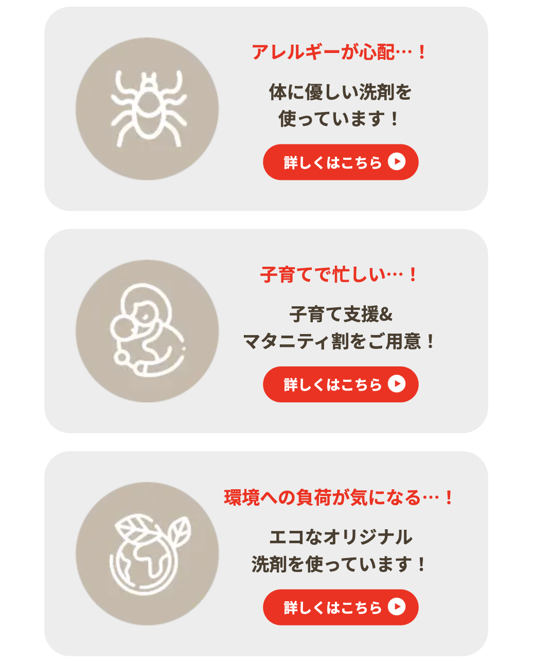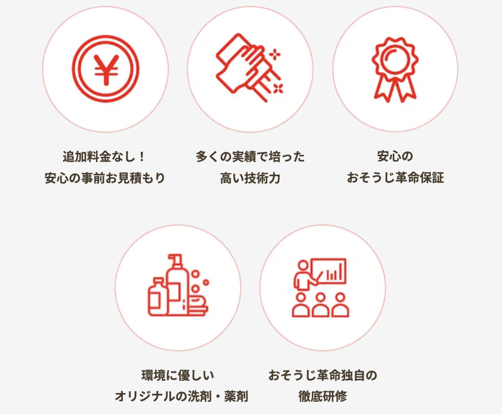 おそうじ革命は累計15万件以上の実績を誇り、信頼できる高い技術力で支持をいただいております。 また、人にも環境にも優しいオリジナル洗剤を使用しており、小さなお子さまのいらっしゃるご家庭でも安心して依頼いただけます。 さらに、ご満足いただけなければ、追加料金なしで再作業いたします。 妊婦さんや、子育てで忙しい親御さんのために割引もご用意しておりますので、お気軽にご相談ください。