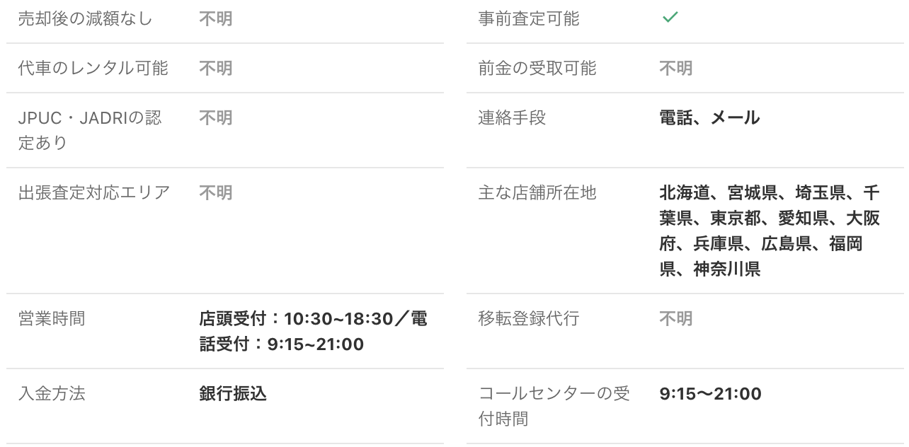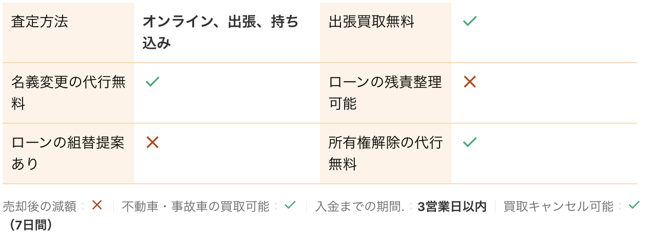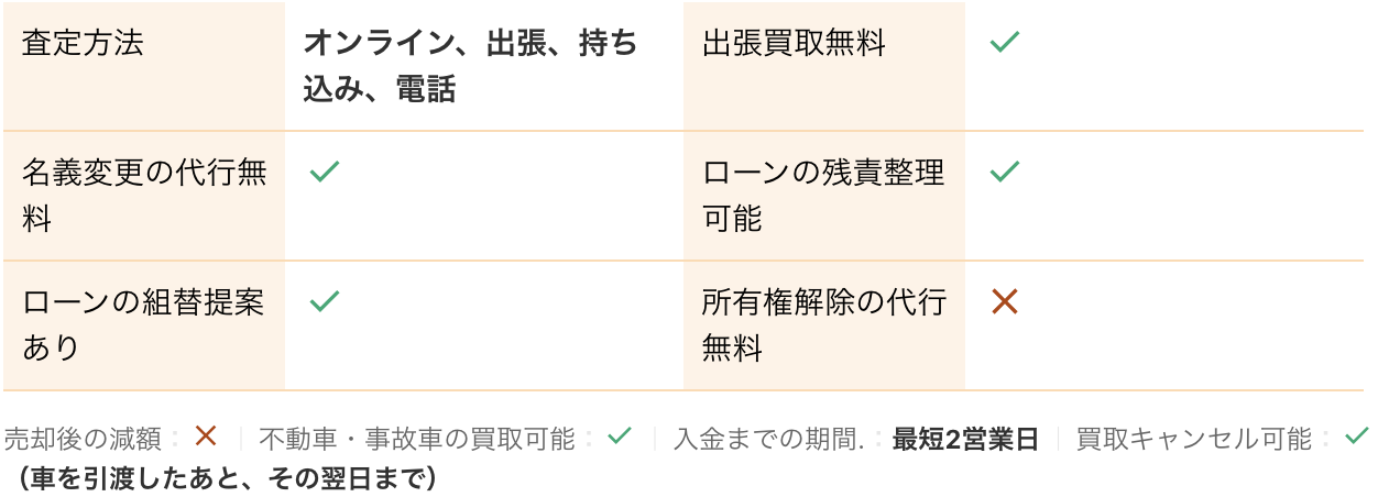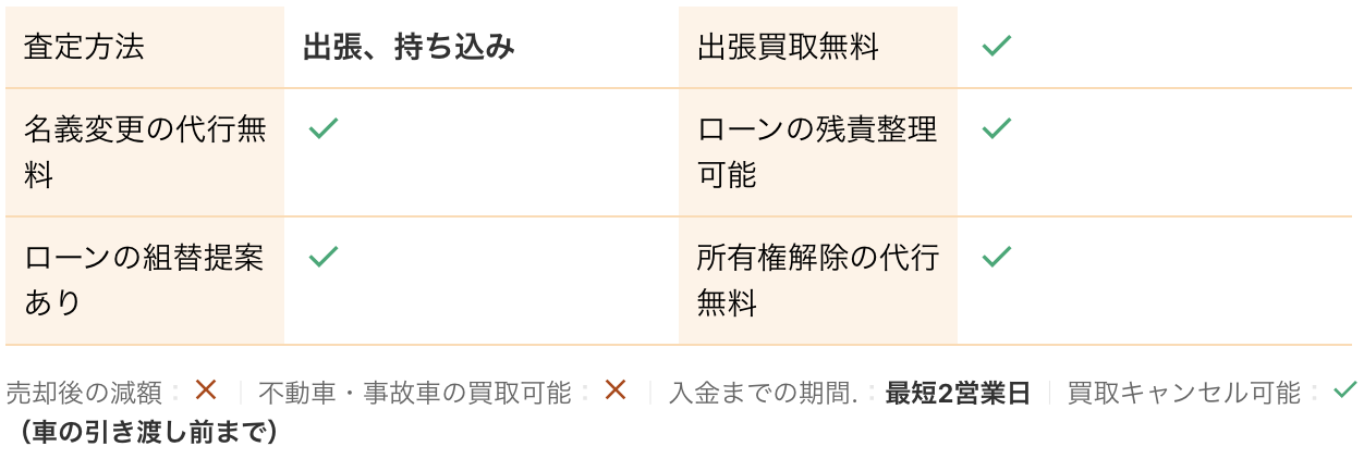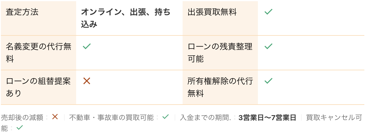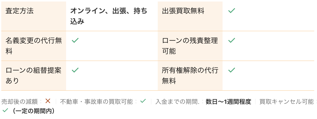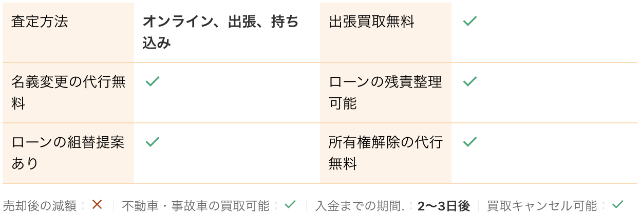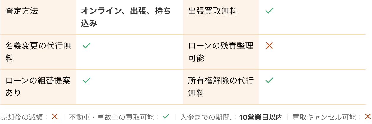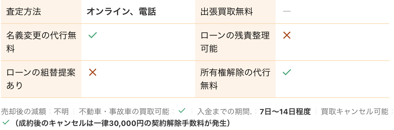<PR> 車の買取を行っている業者は大手から地域密着型などさまざまです。買取業者によって査定方法や入金速度、対応エリアなど確認すべきポイントが数多く存在します。車の買取金額を上げるためには、希望にマッチする買取業者の選択が必要です。 車買取・中古車買取のおすすめ人気ランキング【車を売るならどこがいい?】 新車の購入や環境の変化にあわせて中古車を売るなら、「車買取業者」の利用がおすすめ。基本的に無料査定なので相見積もりすれば高額の業者を見つけられるうえ、所有権解除・名義変更といった面倒な手続きを代行してくれるのも魅力です。しかし、カーネクスト・アップル・ラビット・ガリバーなど業者が多く、「車を売るならどこがいいの?」と迷ってしまいますよね。 そこで今回は、車買取・中古車買取の選び方を解説。さらに、おすすめの車買取業者を人気ランキング形式でご紹介します。下取りとの違いや、相場より高く売るコツなども紹介しているので、ぜひ売却する際の参考にしてくださいね。 <このページはプロモーションを含みます> 買取と下取りの違いは?どっちがおすすめ? より高い買取金額を求めるなら買取、より手間を省きたいなら下取りがおすすめです。 そもそも、買取とは中古車販売・買取業者に車を売りその対価としてお金を受け取ること。一方、下取りは基本的に新車を購入することを前提に、古い車の下取り価格を新車代金から引くことで通常より安く新車を購入することを指します。 金額を重視する人は、少し手間はかかるものの買取一択。新車の購入予定がなくても利用できるうえ、中古車市場の相場価格がダイレクトに反映されるのが魅力です。他社との相見積もりがしやすいので高額査定を出せる車買取業者を見極められ、最終的な買取金額も上がりやすいでしょう。 しかし、下取りは新車購入から旧車の処分までの手続きを店側がすべて行ってくれるため、買取より圧倒的に手間がかからないのは魅力です。新車の購入を検討していて、手間と時間をかけたくない人には下取りも有力な選択肢といえるでしょう。 車を高く売るのにおすすめの時期はいつ? 自動車が比較的高く売れるシーズンは、6・7・8月です。理由は、業者間のオークションが一番活発で、車が売れやすい時期といえるから。あくまで目安ではありますが、急いで自動車を売る必要がないのなら、高く売れるシーズンにうまくあわせて売るのが賢い手ですよ。 一方、3・4月は値段がつきにくくなるので注意しましょう。3月は車買取業者の決算時期であり、年内に売れなかった車がオークションに増えるため、値がつきにくい傾向があります。 半導体不足・円安で輸入車の価格高騰はもちろん、各メーカーからの生産減での新車の納車遅れなどの影響を受けて中古車の需要増加が続いています。車種にもよりますが、中古車を売りたい人はチャンスといえるでしょう。 車買取・中古車買取の選び方 車買取・中古車買取を選ぶ際に必ずチェックしておきたい「4つのポイント」をご紹介します。 少しでも高く売りたければ、3〜5社相見積もりして最も高額な車買取業者に売ろう とにかく高く売りたい人は、3〜5社相見積もりしてから最も高い査定額が出た車買取業者に売りましょう。車種・売却するタイミングはもちろん、得意とする車種も業者によって異なるため、相見積もりで最も高く買い取れる車買取業者を見つけることが大切です。 業者ごとにそこまで差は出ないと思われるかもしれませんが、査定士が目視で修復歴を判断するため、同じ自動車の査定でも結果は異なります。なかには、一度修復歴ありと判断されてもほかの業者では修復歴なしと判断されるケースも。 3〜5社ほど見積もりを出せば十分な材料をもとに比較検討でき、適正に査定してくれる業者を見つけられるでしょう。少しでも高額査定につなげるために、オプション情報や必要書類を不足なく用意する・修復歴の申告は嘘をつかない・事前に自動車の手入れをしておくという3点を守ってくださいね。 実際に車買取業者の何社かに電話見積もりを依頼しましたが、査定最高額と最低額が約40万円もの差になることもありました。 高価買取につなげるためには、これくらいが相場という情報を持って「この金額まで行けばこの場で決めます」という状況を作り出すことが重要です。交渉の主導権を握るためにも、相場の情報は知っておくとよいでしょう。 手間なく売るには、出張査定・所有権解除代行・名義変更代行の3つがマスト 中古車買取において査定の手間を大きく左右するのは、出張査定・所有権解除代行・名義変更代行の3つに対応しているかどうかです。順番に解説していくので、ぜひ参考にしてください。 出張査定なら自宅の駐車場で完結!基本的に無料で査定してくれる 査定にかける手間を減らしたいなら、自宅にいながら対応してもらえる出張査定がぴったりです。店舗査定と違い店舗への移動時間を短
