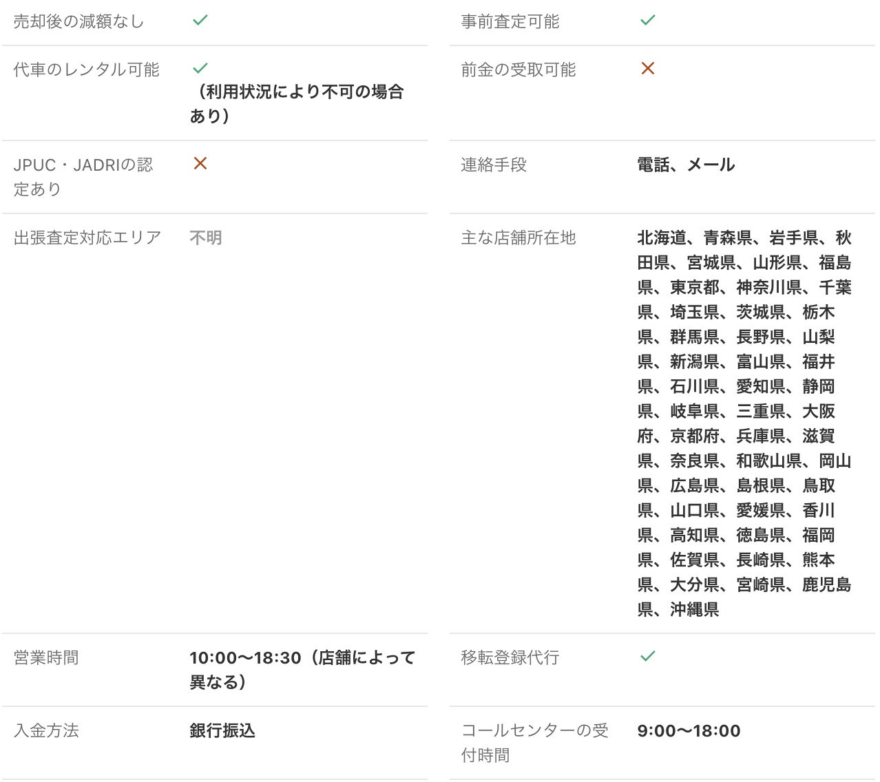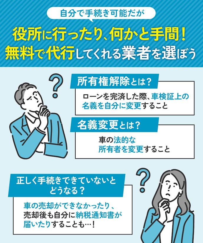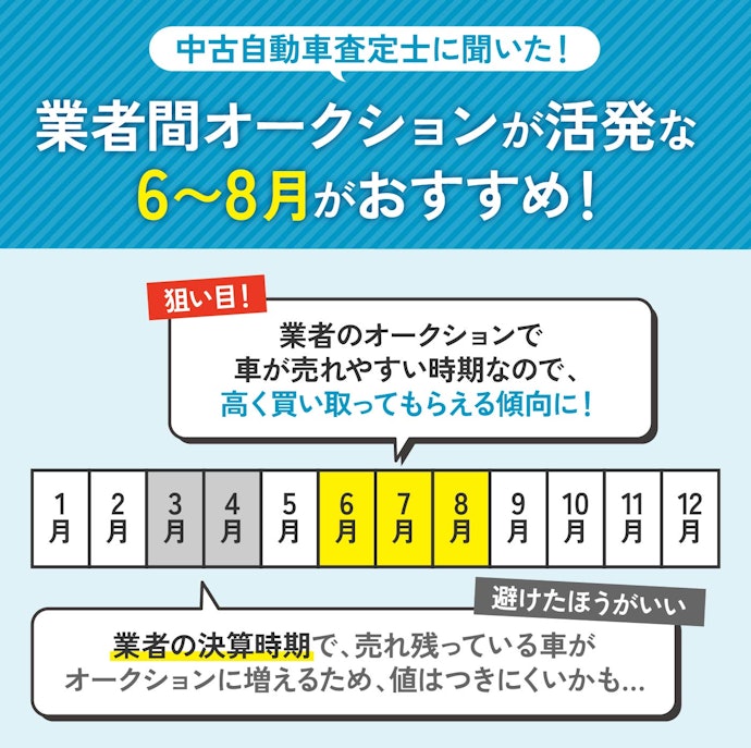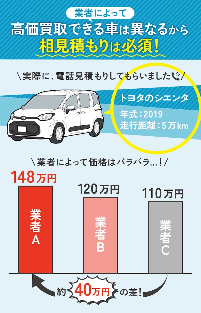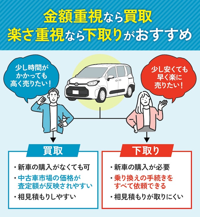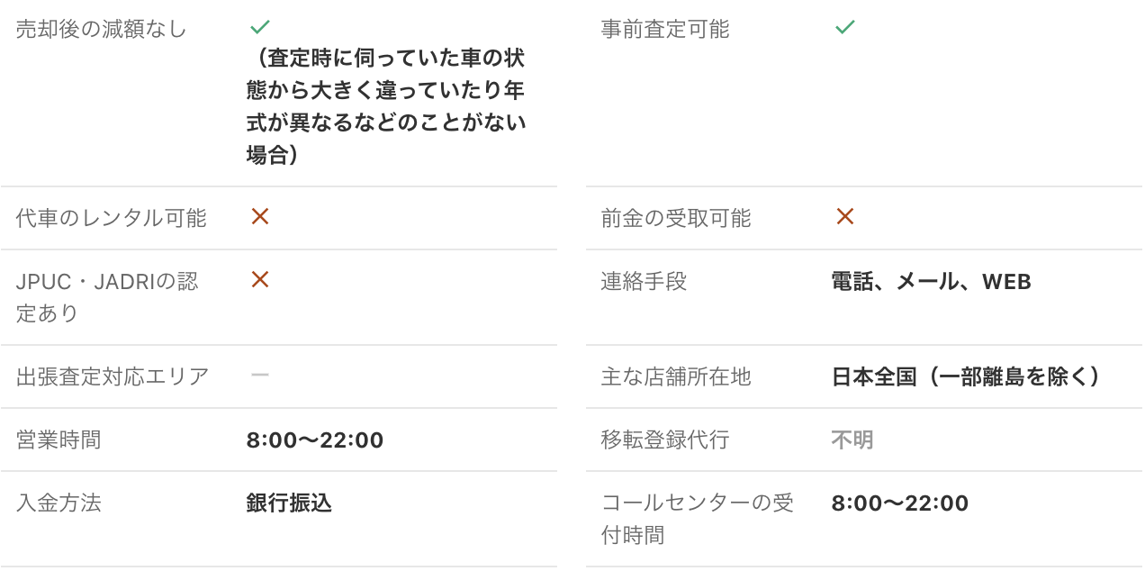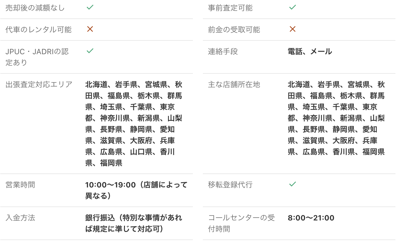 <PR> 車の買取を行っている業者は大手から地域密着型などさまざまです。買取業者によって査定方法や入金速度、対応エリアなど確認すべきポイントが数多く存在します。車の買取金額を上げるためには、希望にマッチする買取業者の選択が必要です。 車買取・中古車買取のおすすめ人気ランキング【車を売るならどこがいい?】 新車の購入や環境の変化にあわせて中古車を売るなら、「車買取業者」の利用がおすすめ。基本的に無料査定なので相見積もりすれば高額の業者を見つけられるうえ、所有権解除・名義変更といった面倒な手続きを代行してくれるのも魅力です。しかし、カーネクスト・アップル・ラビット・ガリバーなど業者が多く、「車を売るならどこがいいの?」と迷ってしまいますよね。 そこで今回は、車買取・中古車買取の選び方を解説。さらに、おすすめの車買取業者を人気ランキング形式でご紹介します。下取りとの違いや、相場より高く売るコツなども紹介しているので、ぜひ売却する際の参考にしてくださいね。 <このページはプロモーションを含みます> 買取と下取りの違いは?どっちがおすすめ? より高い買取金額を求めるなら買取、より手間を省きたいなら下取りがおすすめです。 そもそも、買取とは中古車販売・買取業者に車を売りその対価としてお金を受け取ること。一方、下取りは基本的に新車を購入することを前提に、古い車の下取り価格を新車代金から引くことで通常より安く新車を購入することを指します。 金額を重視する人は、少し手間はかかるものの買取一択。新車の購入予定がなくても利用できるうえ、中古車市場の相場価格がダイレクトに反映されるのが魅力です。他社との相見積もりがしやすいので高額査定を出せる車買取業者を見極められ、最終的な買取金額も上がりやすいでしょう。 しかし、下取りは新車購入から旧車の処分までの手続きを店側がすべて行ってくれるため、買取より圧倒的に手間がかからないのは魅力です。新車の購入を検討していて、手間と時間をかけたくない人には下取りも有力な選択肢といえるでしょう。 車を高く売るのにおすすめの時期はいつ? 自動車が比較的高く売れるシーズンは、6・7・8月です。理由は、業者間のオークションが一番活発で、車が売れやすい時期といえるから。あくまで目安ではありますが、急いで自動車を売る必要がないのなら、高く売れるシーズンにうまくあわせて売るのが賢い手ですよ。 一方、3・4月は値段がつきにくくなるので注意しましょう。3月は車買取業者の決算時期であり、年内に売れなかった車がオークションに増えるため、値がつきにくい傾向があります。 半導体不足・円安で輸入車の価格高騰はもちろん、各メーカーからの生産減での新車の納車遅れなどの影響を受けて中古車の需要増加が続いています。車種にもよりますが、中古車を売りたい人はチャンスといえるでしょう。 車買取・中古車買取の選び方 車買取・中古車買取を選ぶ際に必ずチェックしておきたい「4つのポイント」をご紹介します。 少しでも高く売りたければ、3〜5社相見積もりして最も高額な車買取業者に売ろう とにかく高く売りたい人は、3〜5社相見積もりしてから最も高い査定額が出た車買取業者に売りましょう。車種・売却するタイミングはもちろん、得意とする車種も業者によって異なるため、相見積もりで最も高く買い取れる車買取業者を見つけることが大切です。 業者ごとにそこまで差は出ないと思われるかもしれませんが、査定士が目視で修復歴を判断するため、同じ自動車の査定でも結果は異なります。なかには、一度修復歴ありと判断されてもほかの業者では修復歴なしと判断されるケースも。 3〜5社ほど見積もりを出せば十分な材料をもとに比較検討でき、適正に査定してくれる業者を見つけられるでしょう。少しでも高額査定につなげるために、オプション情報や必要書類を不足なく用意する・修復歴の申告は嘘をつかない・事前に自動車の手入れをしておくという3点を守ってくださいね。 実際に車買取業者の何社かに電話見積もりを依頼しましたが、査定最高額と最低額が約40万円もの差になることもありました。 高価買取につなげるためには、これくらいが相場という情報を持って「この金額まで行けばこの場で決めます」という状況を作り出すことが重要です。交渉の主導権を握るためにも、相場の情報は知っておくとよいでしょう。 手間なく売るには、出張査定・所有権解除代行・名義変更代行の3つがマスト 中古車買取において査定の手間を大きく左右するのは、出張査定・所有権解除代行・名義変更代行の3つに対応しているかどうかです。順番に解説していくので、ぜひ参考にしてください。 出張査定なら自宅の駐車場で完結!基本的に無料で査定してくれる 査定にかける手間を減らしたいなら、自宅にいながら対応してもらえる出張査定がぴったりです。店舗査定と違い店舗への移動時間を短